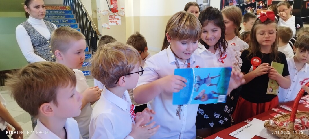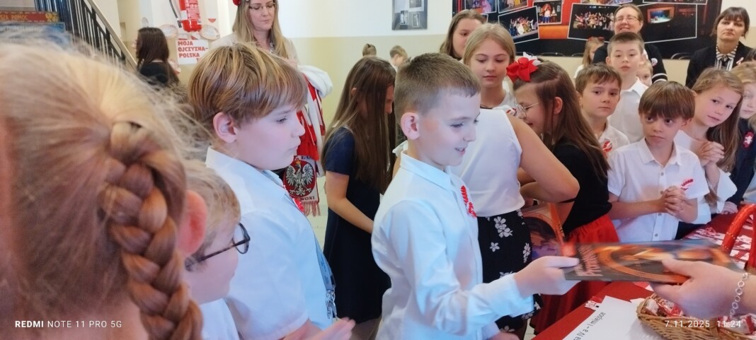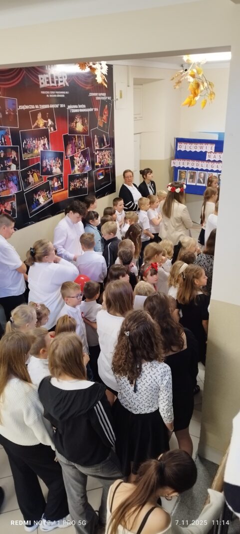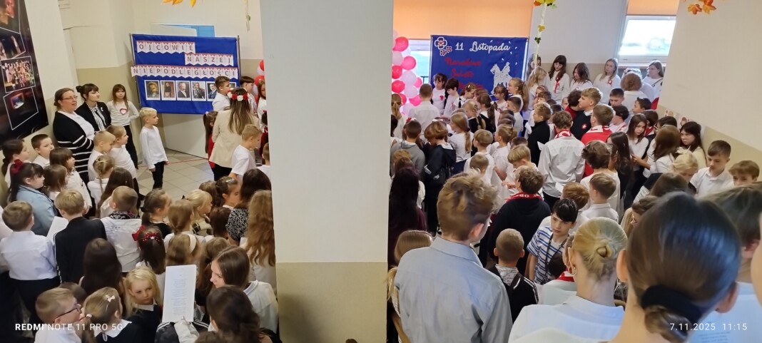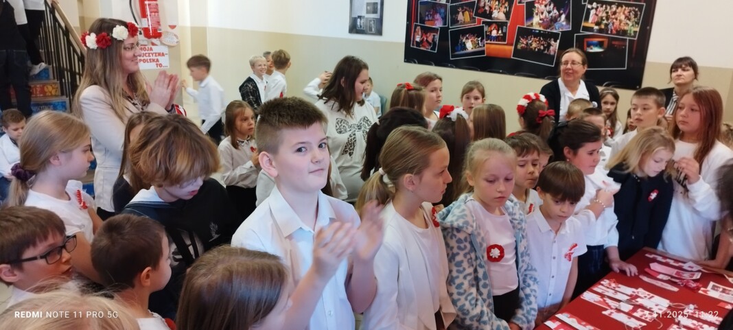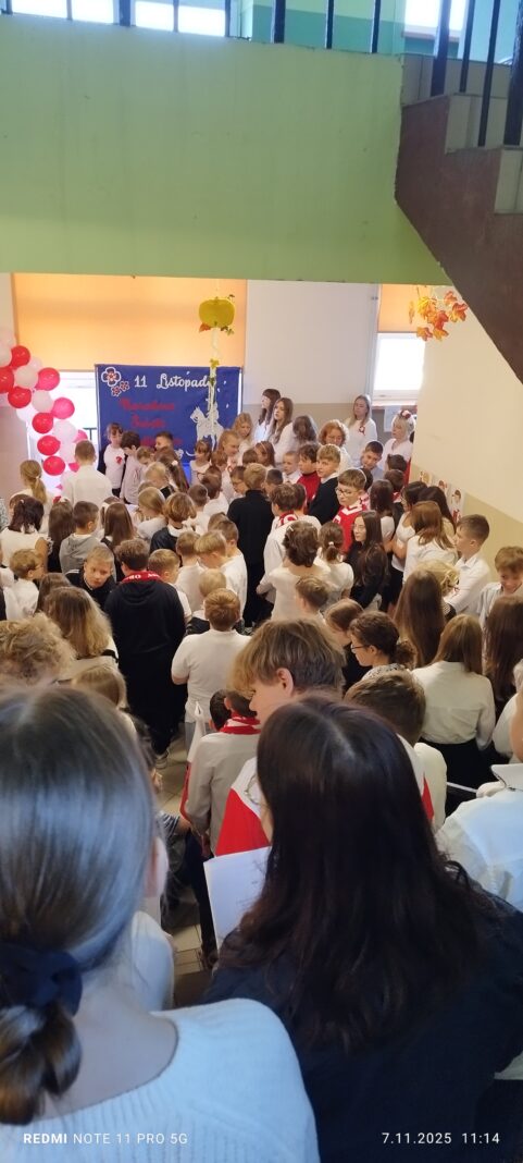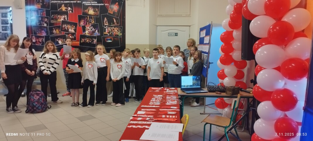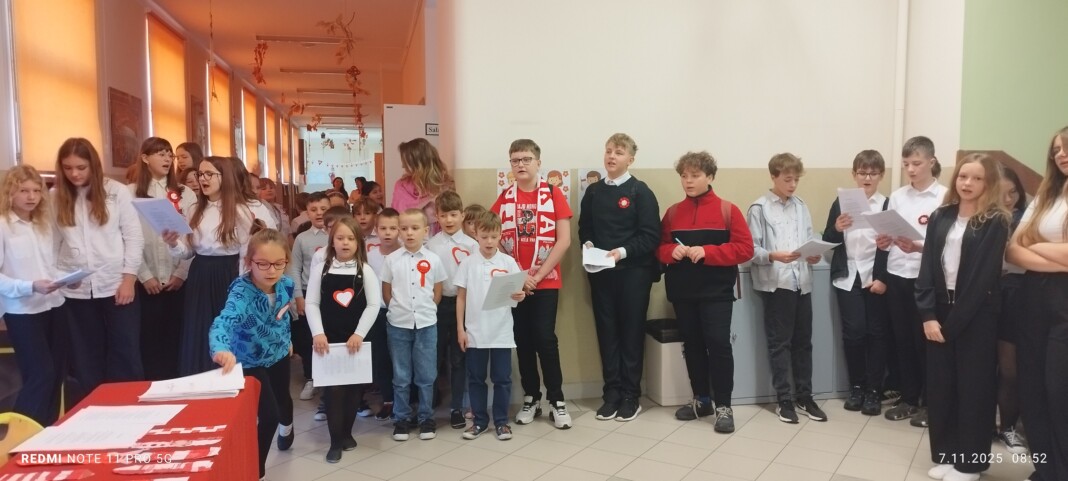 7 listopada 2025 roku świętowaliśmy 107 rocznicę Odzyskania Niepodległości przez Polskę. Nasze najpiękniejsze święto narodowe nasza szkolna społeczność spędziła wesoło i radośnie. Od wczesnych godzin trwał happening „Dla Ciebie, Polsko!”. Uczniowie oglądali filmy o tematyce związanej z odzyskaniem niepodległości, trwały konkursy, zabawy i pogadanki. Na każdej przerwie gromadzili się chętni do śpiewania pieśni niepodległościowych. O godzinie 11.00 zebraliśmy się, aby wspólnie zaśpiewać nasz hymn narodowy w ramach akcji „Szkoła do Hymnu”. Wsłuchani w słowa piosenki Marka Grechuty „Ojczyzna” oczekiwaliśmy na godzinę 11.11.. Pięknie i donośnie zabrzmiał „Mazurek Dąbrowskiego” a po nim Rota Marii Konopnickiej.
