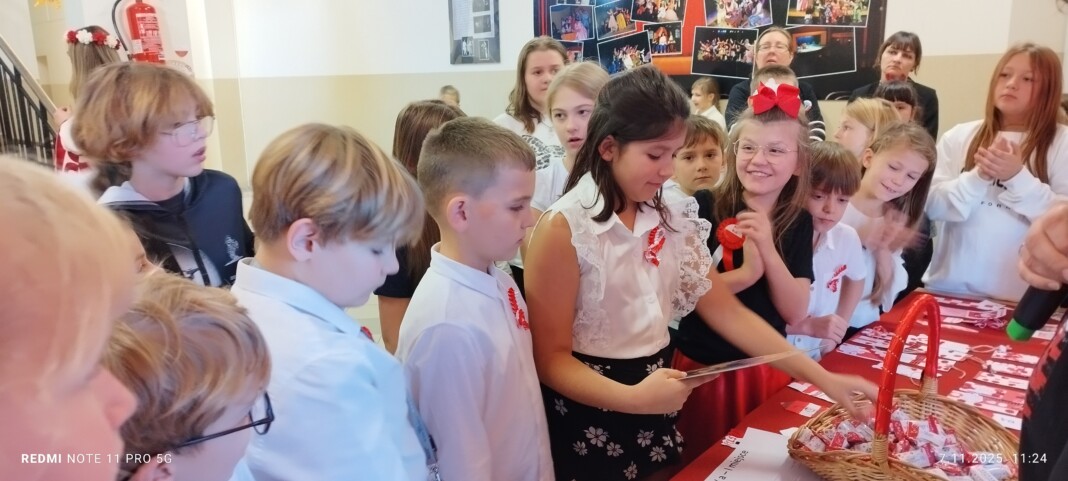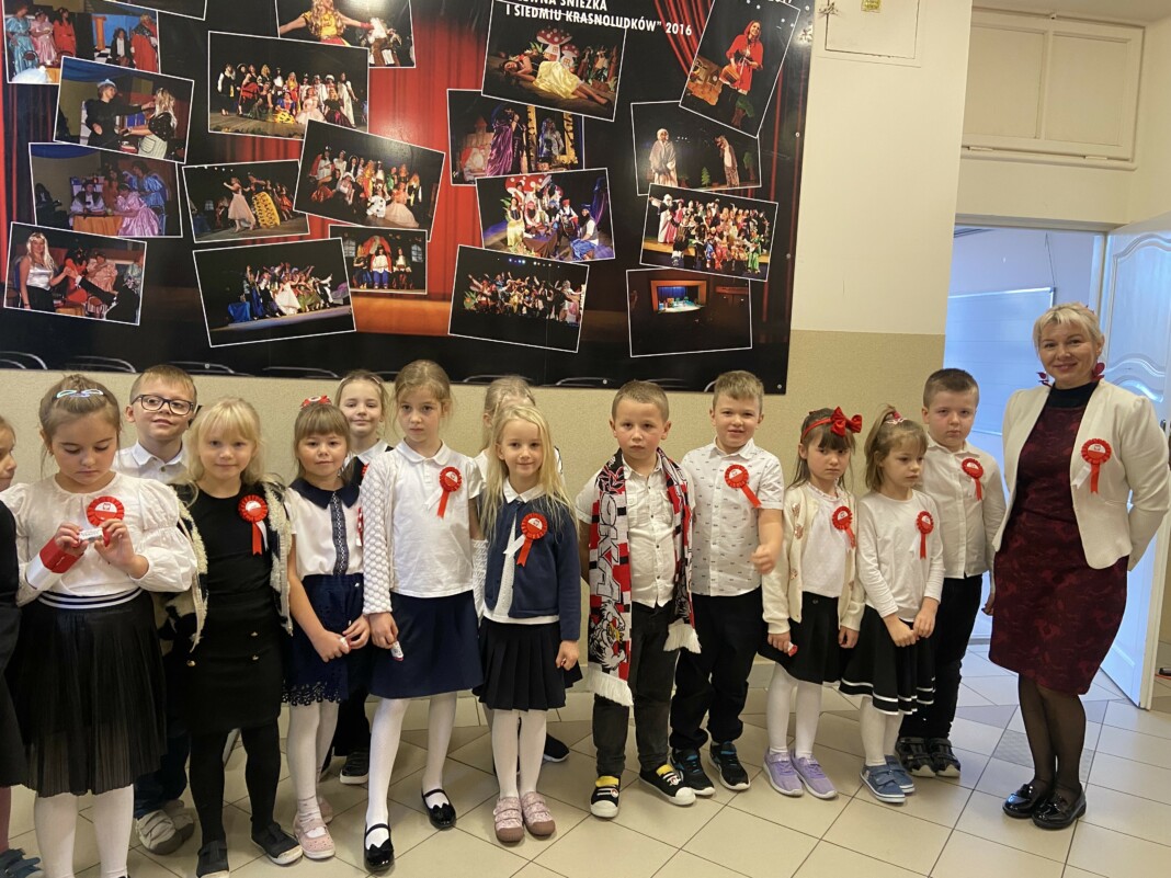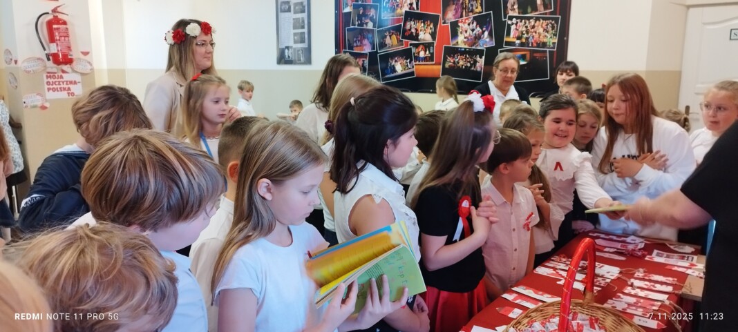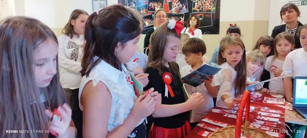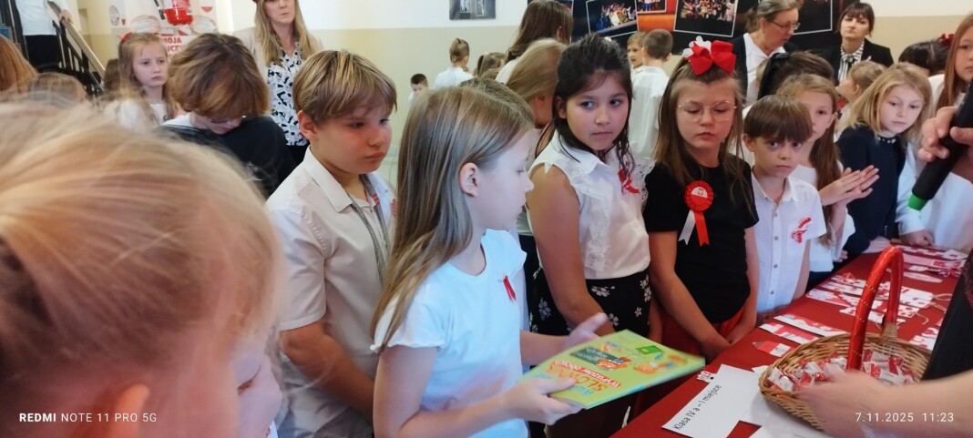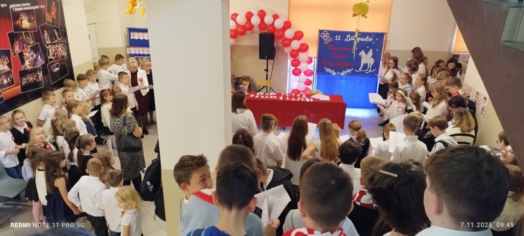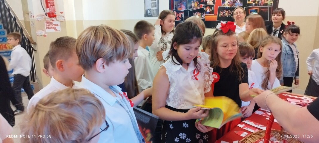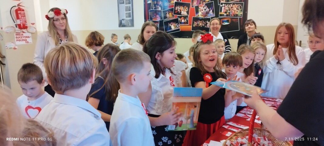 7 listopada 2025 roku świętowaliśmy 107 rocznicę Odzyskania Niepodległości przez Polskę. Nasze najpiękniejsze święto narodowe nasza szkolna społeczność spędziła wesoło i radośnie. Od wczesnych godzin trwał happening „Dla Ciebie, Polsko!”. Uczniowie oglądali filmy o tematyce związanej z odzyskaniem niepodległości, trwały konkursy, zabawy i pogadanki. Na każdej przerwie gromadzili się chętni do śpiewania pieśni niepodległościowych. O godzinie 11.00 zebraliśmy się, aby wspólnie zaśpiewać nasz hymn narodowy w ramach akcji „Szkoła do Hymnu”. Wsłuchani w słowa piosenki Marka Grechuty „Ojczyzna” oczekiwaliśmy na godzinę 11.11.. Pięknie i donośnie zabrzmiał „Mazurek Dąbrowskiego” a po nim Rota Marii Konopnickiej.