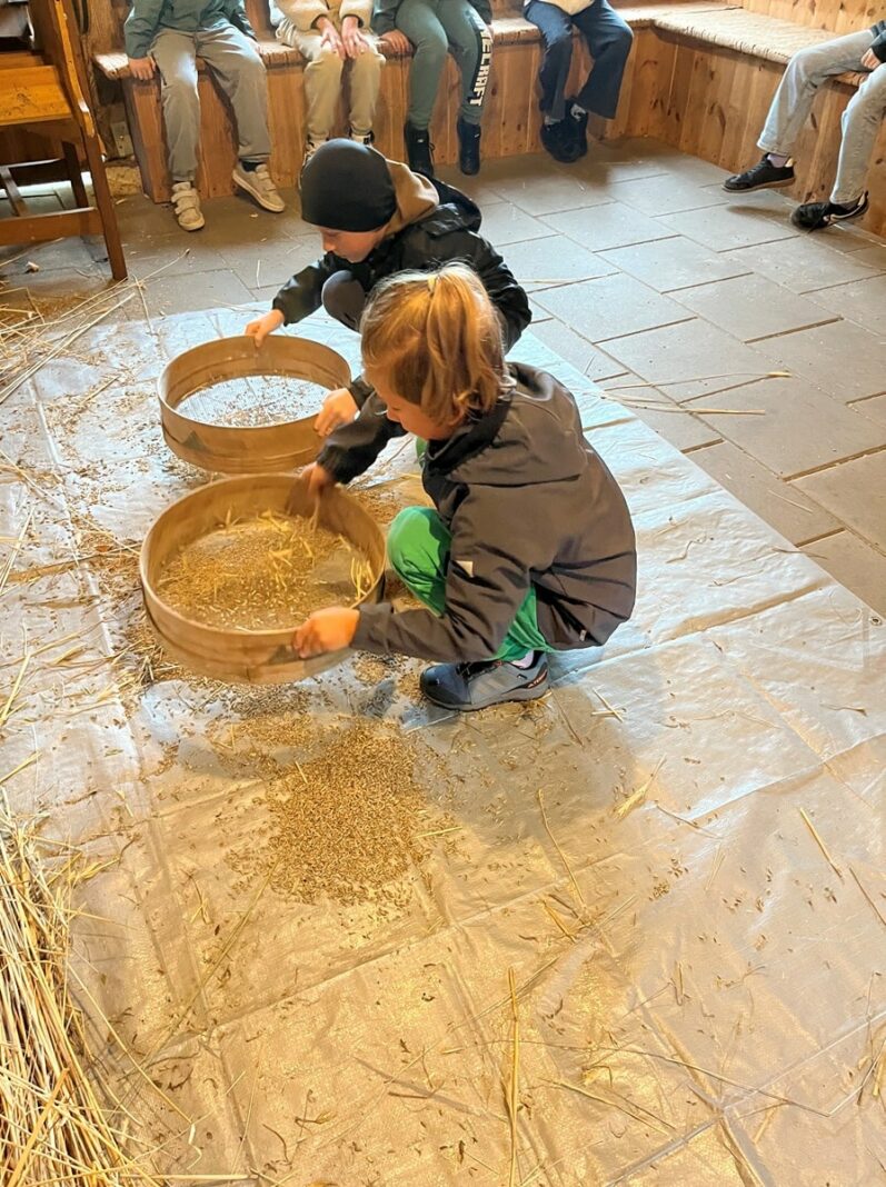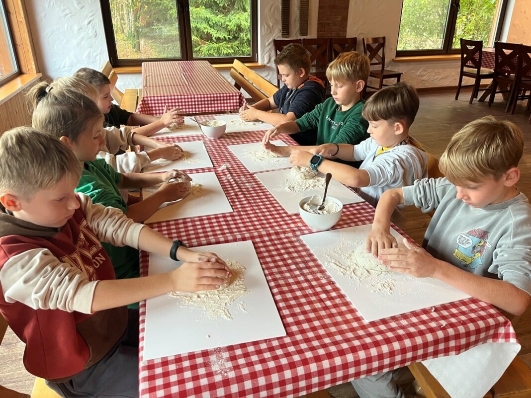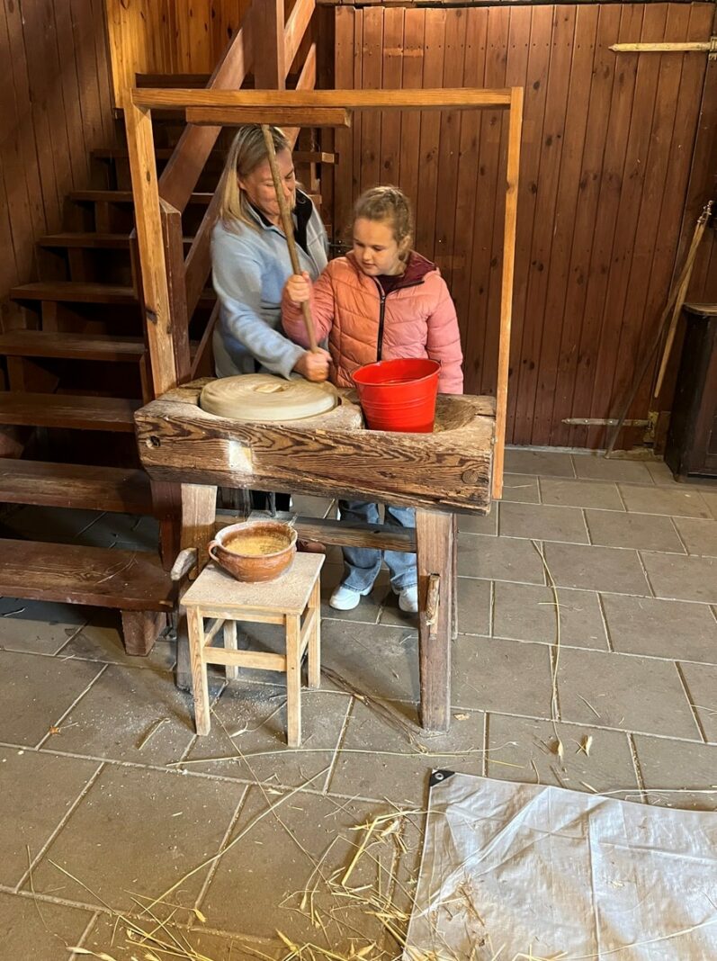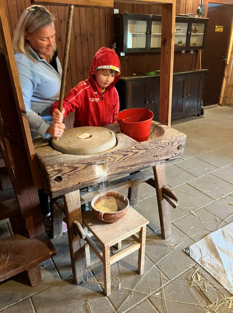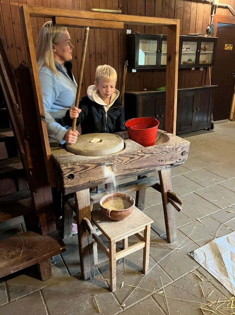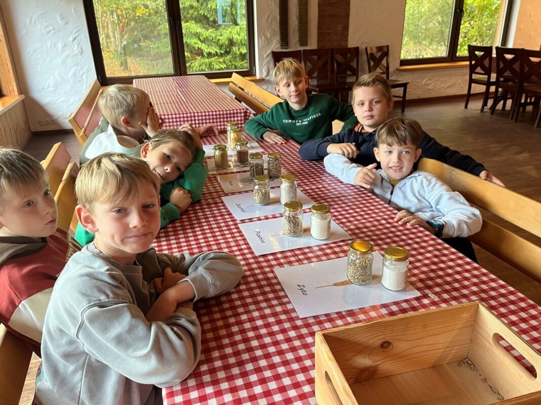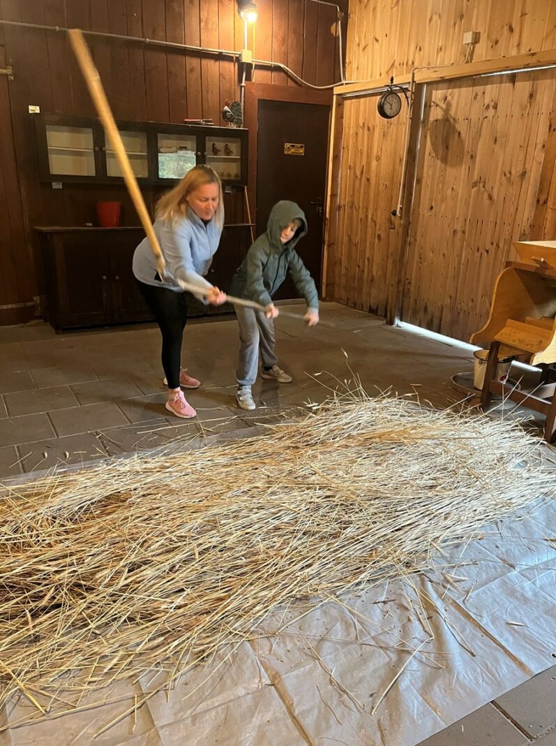 Podczas warsztatów „Od ziarenka do bochenka” dowiedzieliśmy się, jak rozpoznawać różne rodzaje zbóż oraz jakie mąki powstają z poszczególnych gatunków. Mieliśmy okazję samodzielnie spróbować młócenia cepem, przesiewania mąki i mielenia zboża w żarnach. Każdy uczestnik mógł także własnoręcznie uformować i upiec swój bochenek chleba, który po upieczeniu wspaniale pachniał i smakował jeszcze lepiej.