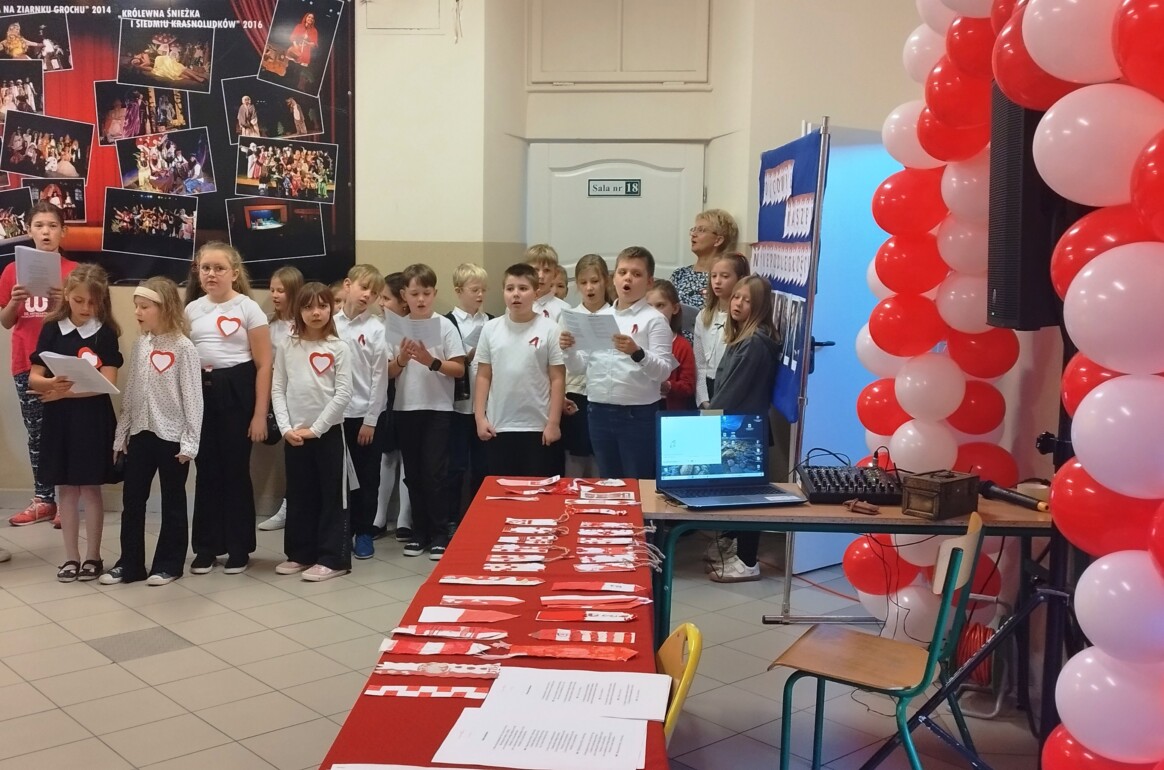 7 listopada 2025 roku świętowaliśmy 107 rocznicę Odzyskania Niepodległości przez Polskę. Nasze najpiękniejsze święto narodowe nasza szkolna społeczność spędziła wesoło i radośnie. Od wczesnych godzin trwał happening „Dla Ciebie, Polsko!”. Uczniowie oglądali filmy o tematyce związanej z odzyskaniem niepodległości, trwały konkursy, zabawy i pogadanki. Na każdej przerwie gromadzili się chętni do śpiewania pieśni niepodległościowych. O godzinie 11.00 zebraliśmy się, aby wspólnie zaśpiewać nasz hymn narodowy w ramach akcji „Szkoła do Hymnu”. Wsłuchani w słowa piosenki Marka Grechuty „Ojczyzna” oczekiwaliśmy na godzinę 11.11.. Pięknie i donośnie zabrzmiał „Mazurek Dąbrowskiego” a po nim Rota Marii Konopnickiej.