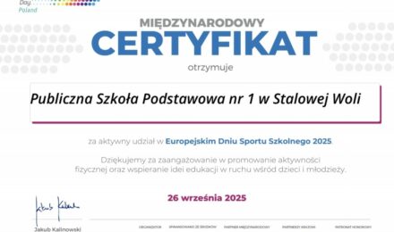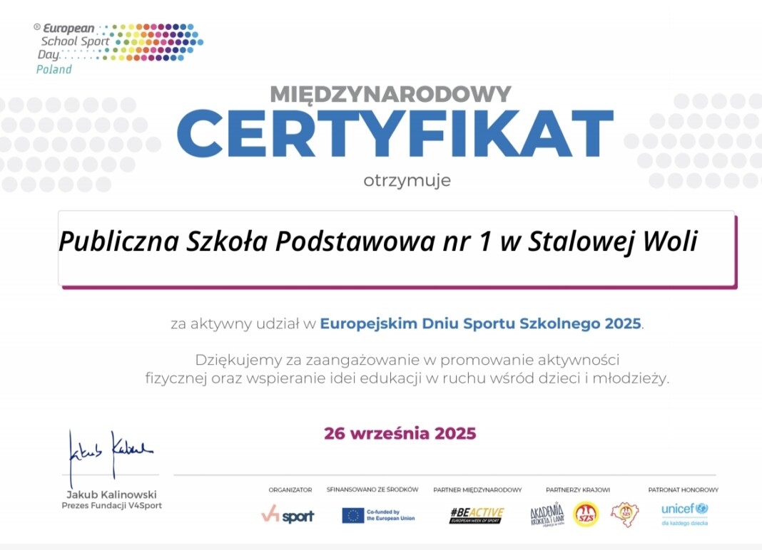 Miło nam poinformować, że otrzymaliśmy wyjątkową nagrodę:) Organizatorzy Europejskiego Dnia Sportu Szkolnego 2025, docenili nasze sportowe działania i przyznali nam Międzynarodowy Certyfikat! Wszystkim uczestnikom serdecznie gratulujemy i życzymy sukcesów sportowych!