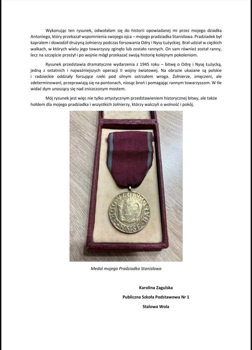 Nagrodzona praca Karoliny powstała w oparciu o autentyczną historię rodzinną. Inspiracją były opowieści dziadka Antoniego, który przekazał wnuczce wspomnienia swojego ojca – pradziadka Stanisława. Był on kapralem dowodzącym drużyną żołnierzy podczas forsowania Odry i Nysy Łużyckiej w 1945 roku. Brał udział w niezwykle trudnych walkach, w których wielu jego towarzyszy poległo lub zostało rannych. Sam również odniósł rany, jednak przeżył wojnę i po jej zakończeniu mógł przekazać swoje doświadczenia kolejnym pokoleniom.